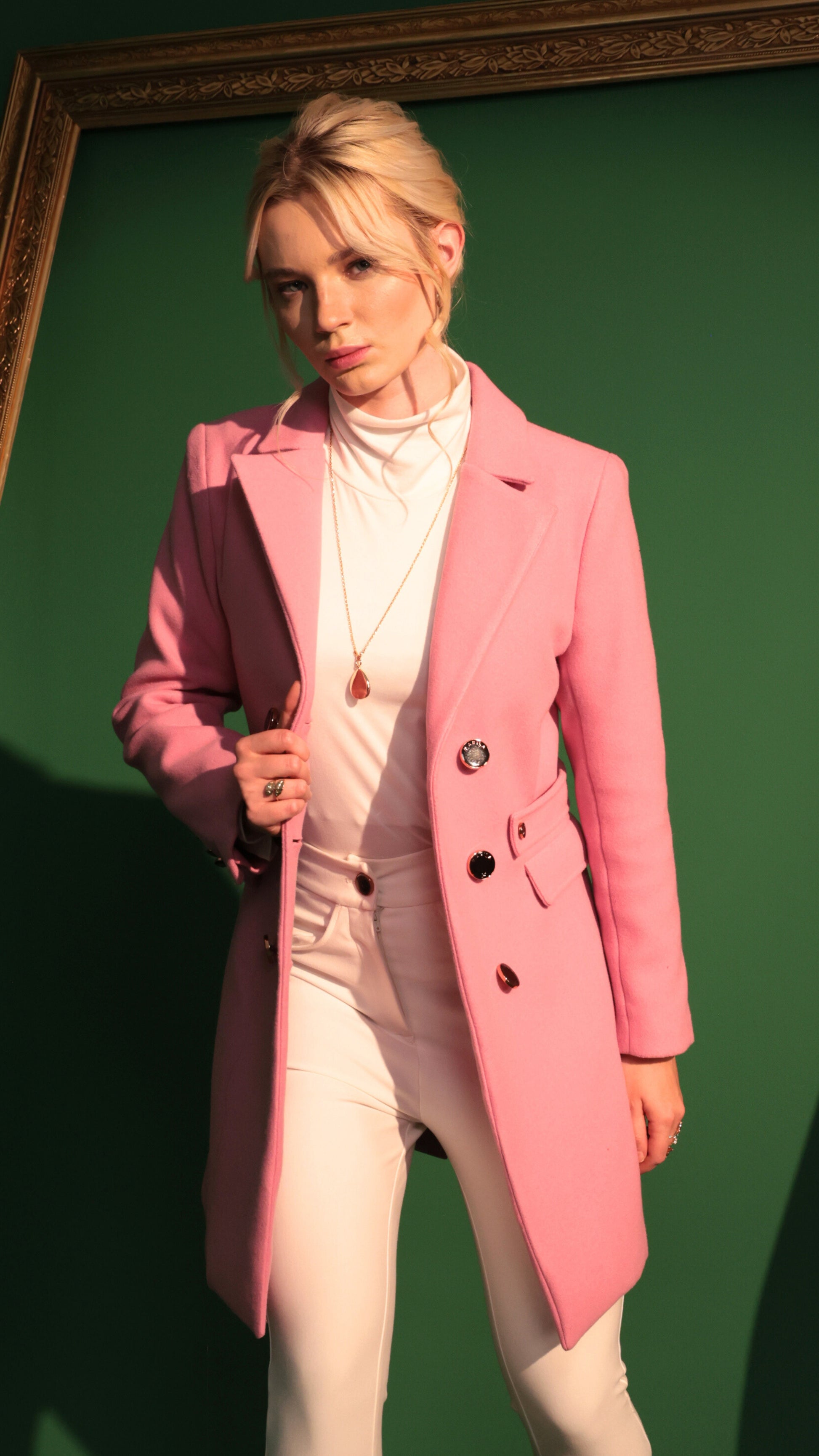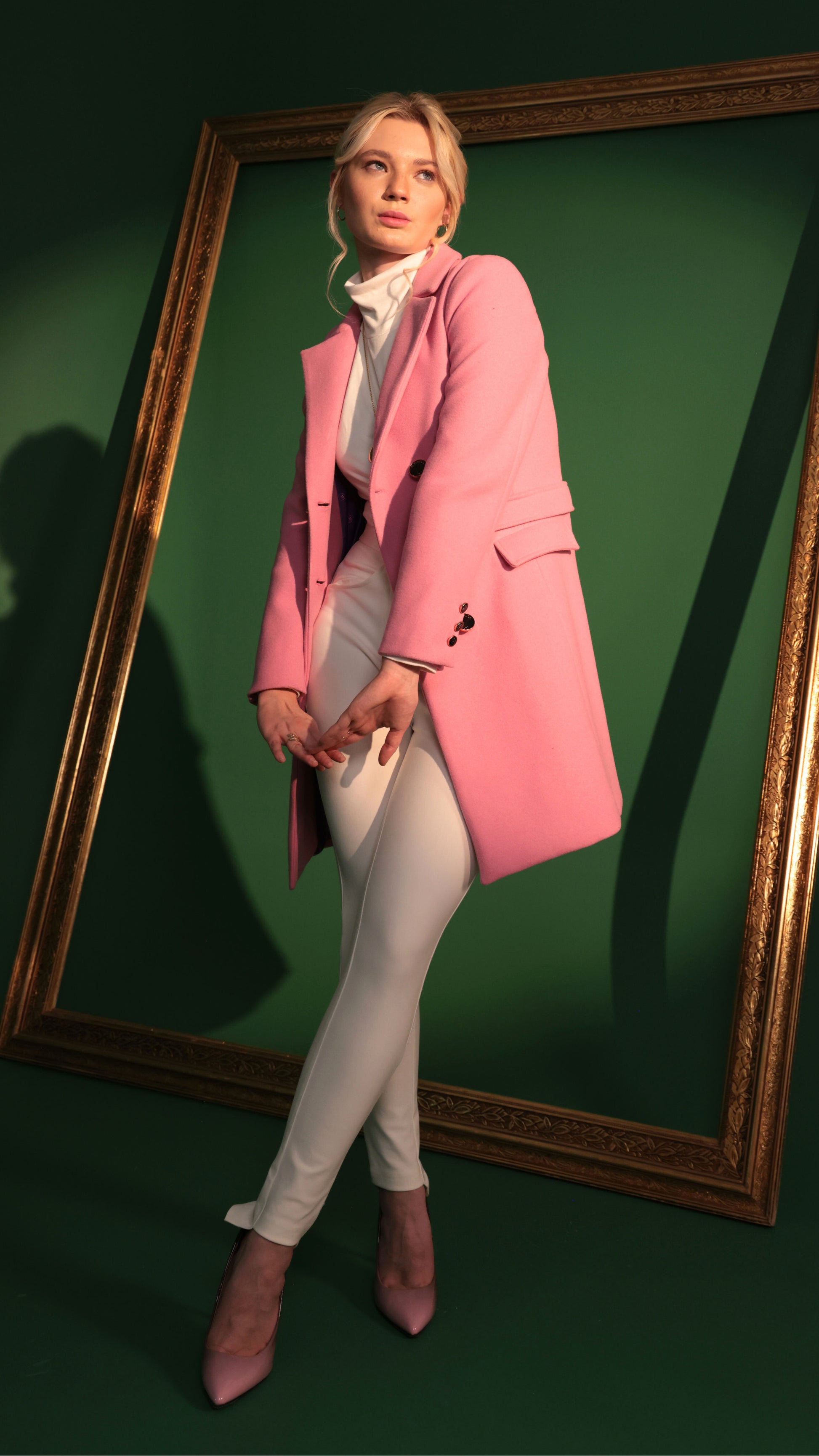Abrigo de corte sastre confeccionado en tejido estructurado de acabado suave. Presenta un diseño recto y ligeramente entallado, con solapas clásicas, doble botonadura frontal con botones decorativos en contraste y bolsillos funcionales en el frente.