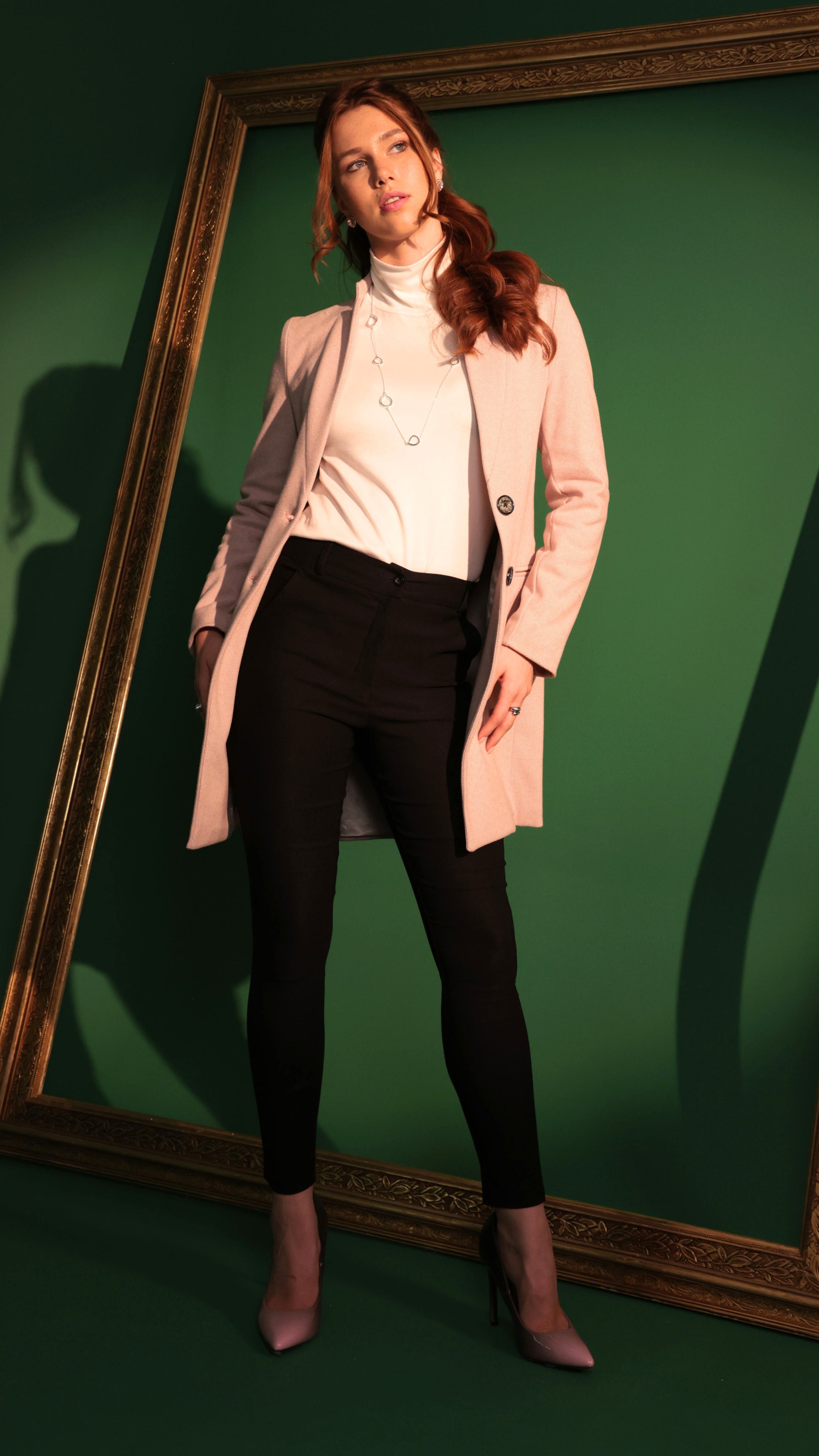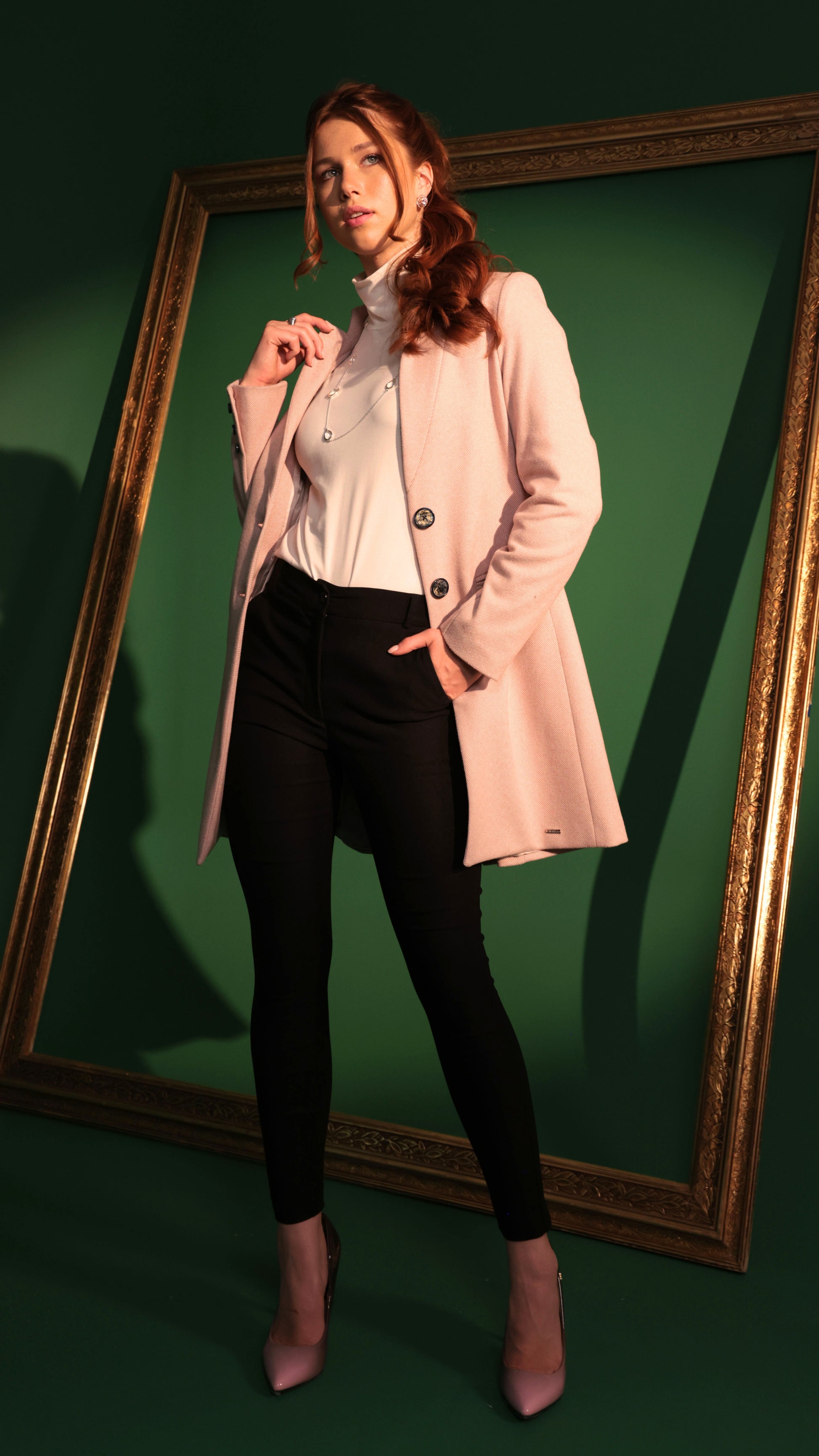 Abrigo largo de tejido estructurado con forro interior, cuello con solapa clásica y botonadura frontal visible. Presenta mangas largas con botones en puños, bolsillos laterales funcionales, corte recto y largo por debajo de la cadera.
