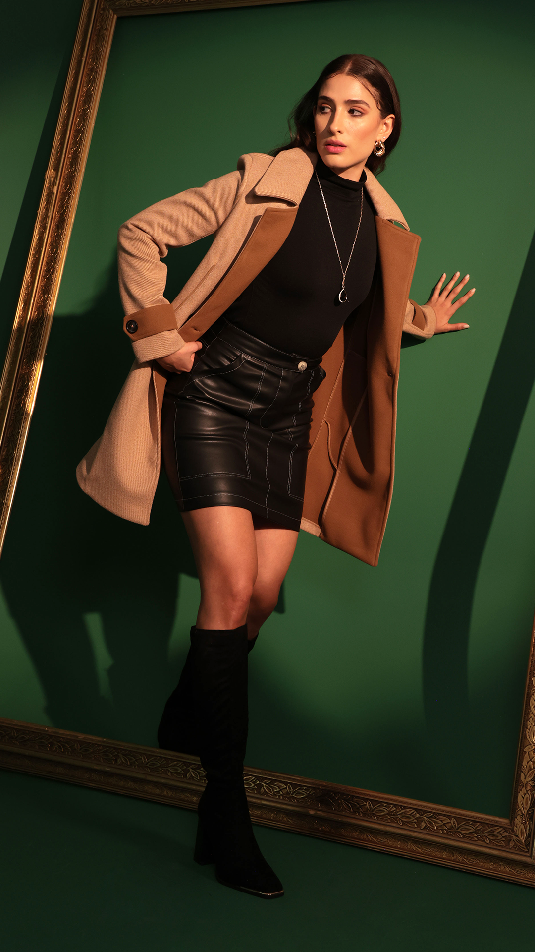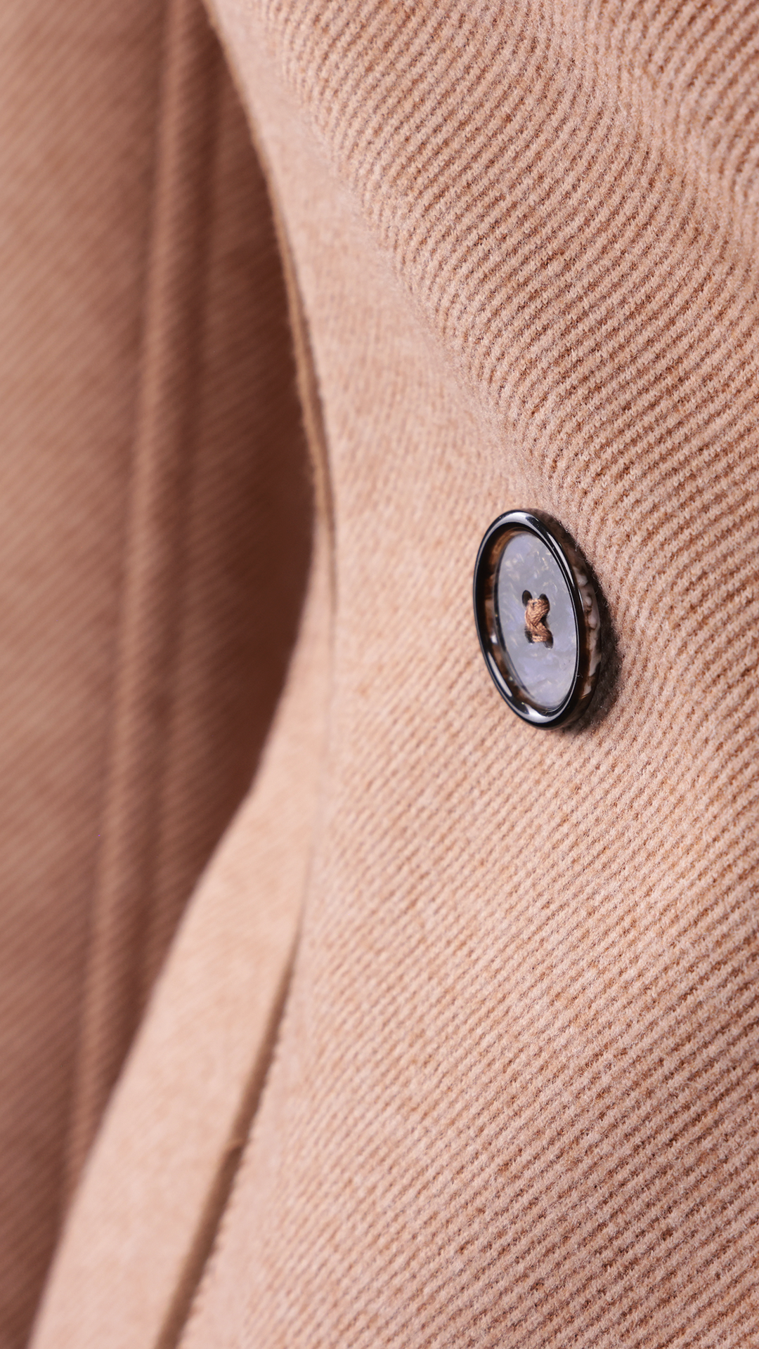 Abrigo confeccionado en tela tipo paño, de textura suave y acabado mate. Diseño estructurado de largo medio, con solapas clásicas, botonadura frontal y manga larga. Presenta ajuste regular y caída firme que aporta abrigo ligero a medio.