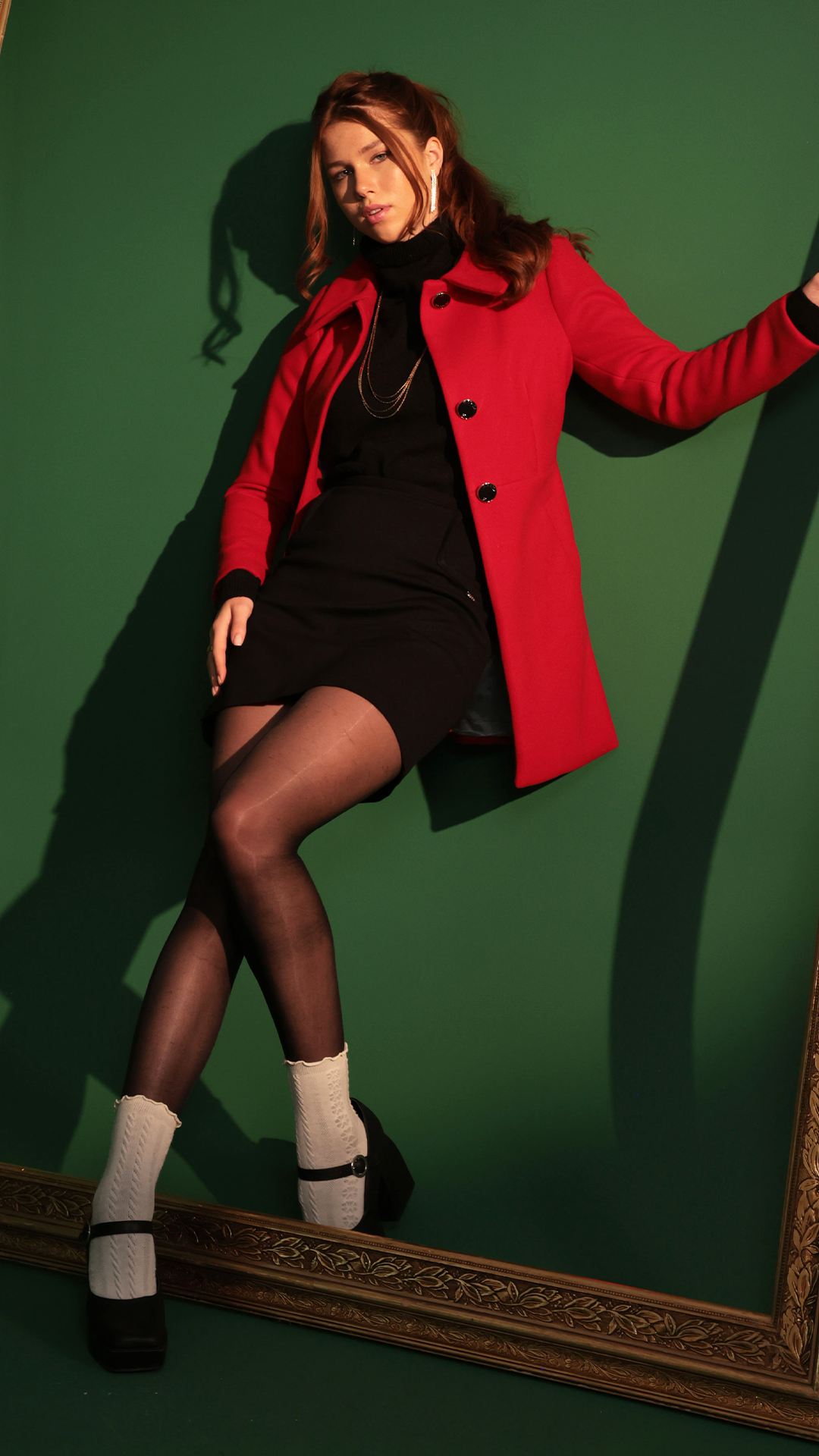 Abrigo confeccionado en tela de paño, con acabado liso y mate. Diseño de corte recto ligeramente entallado. Presenta cuello amplio tipo solapa extendida sin muesca marcada.