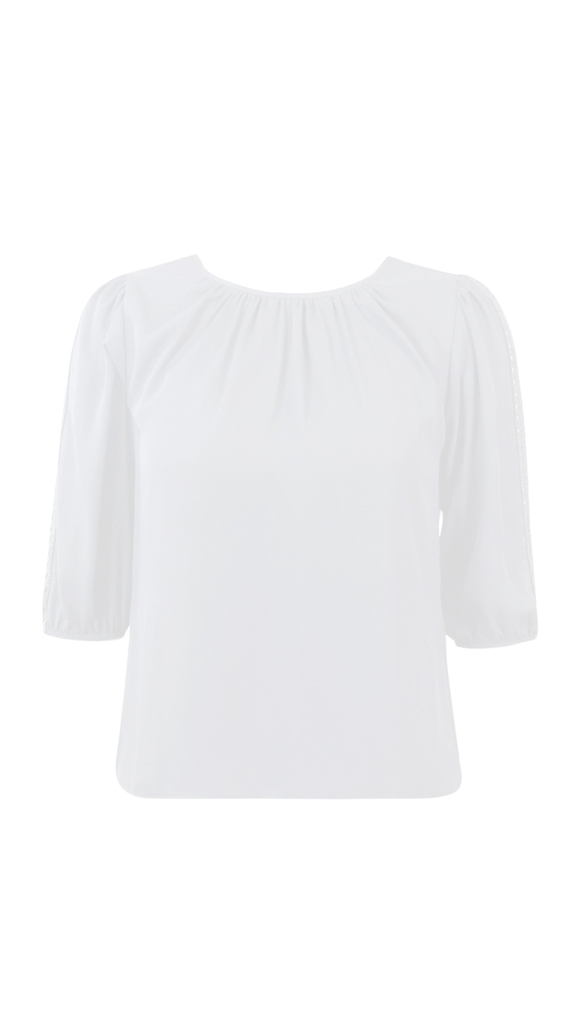 Blusa de corte recto confeccionada en tejido ligero de tacto suave. Presenta cuello redondo con ligero fruncido que aporta caída natural. Las mangas incluyen un detalle decorativo de encaje a lo largo del brazo.