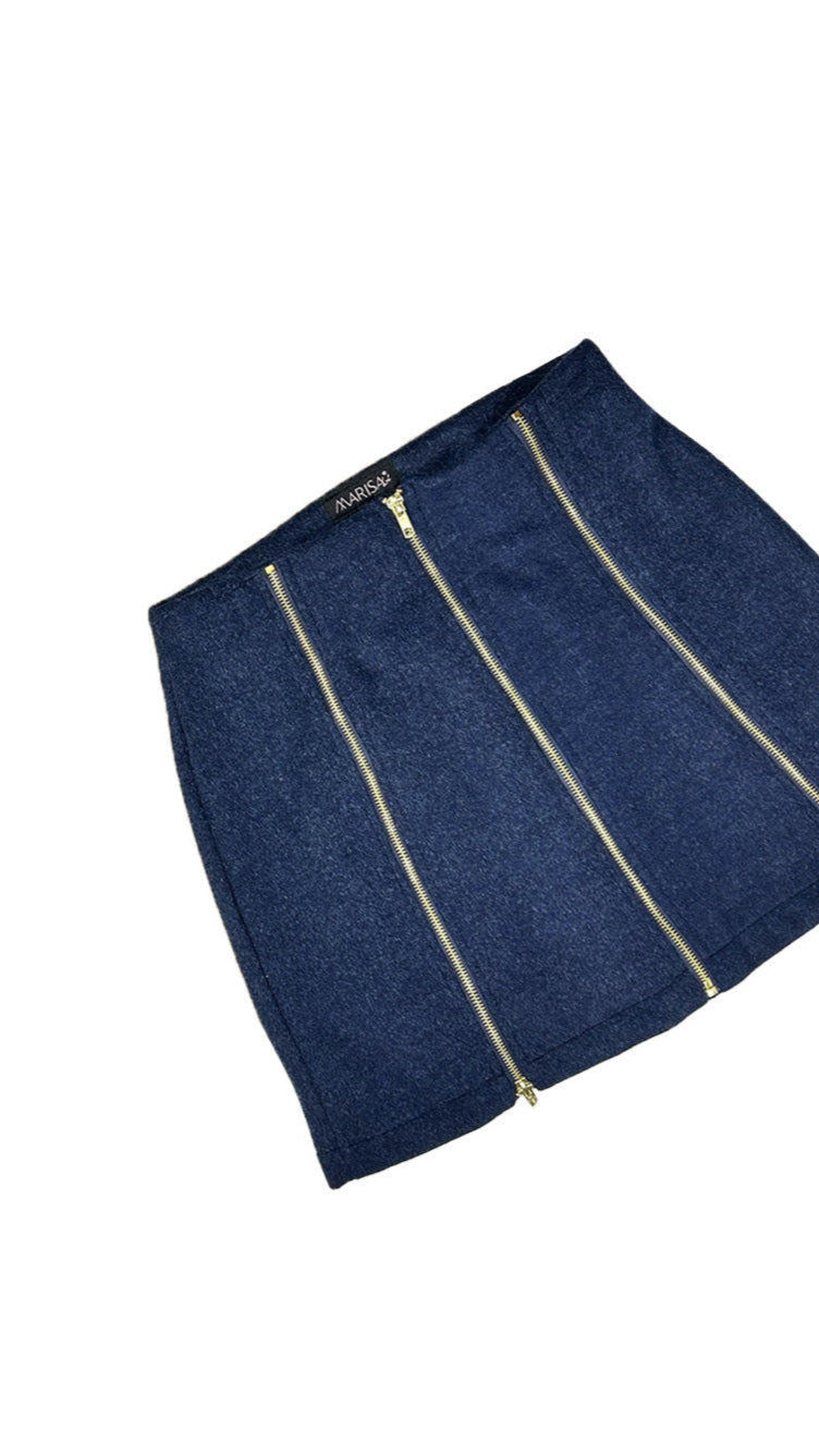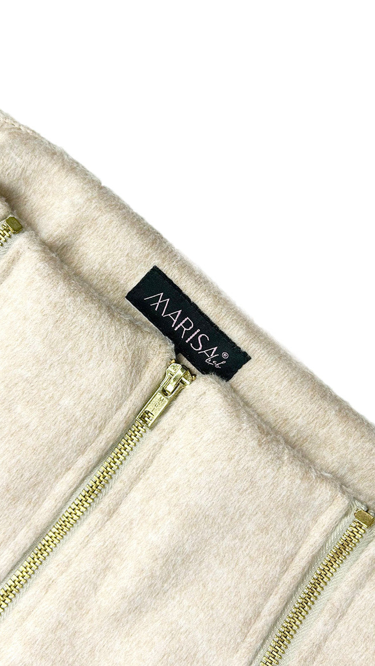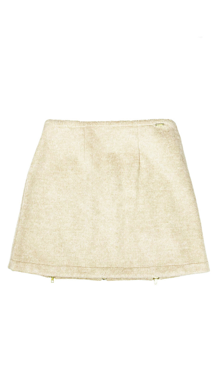 Falda corta de paño, corte línea A, con cierres metálicos funcionales.