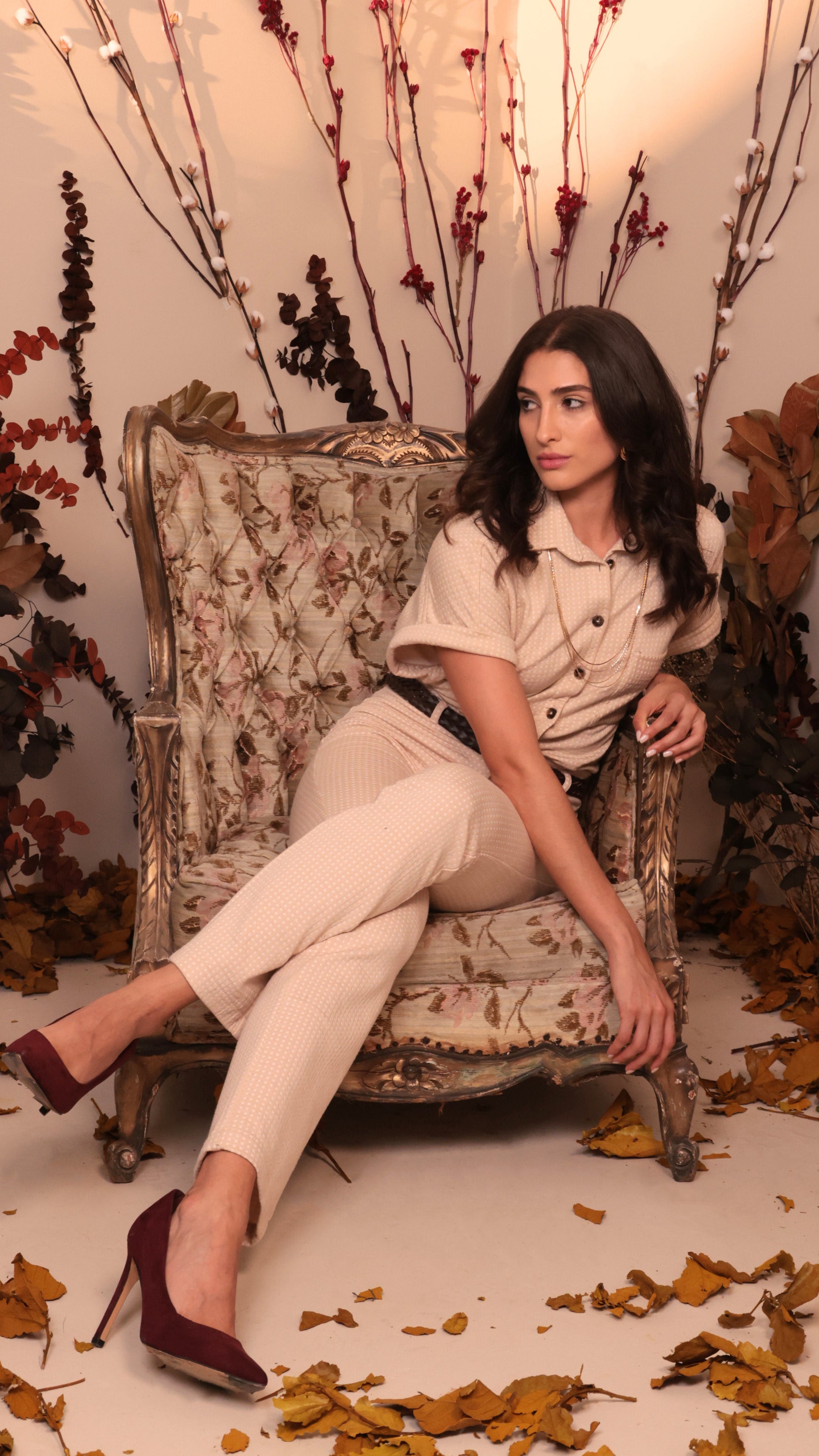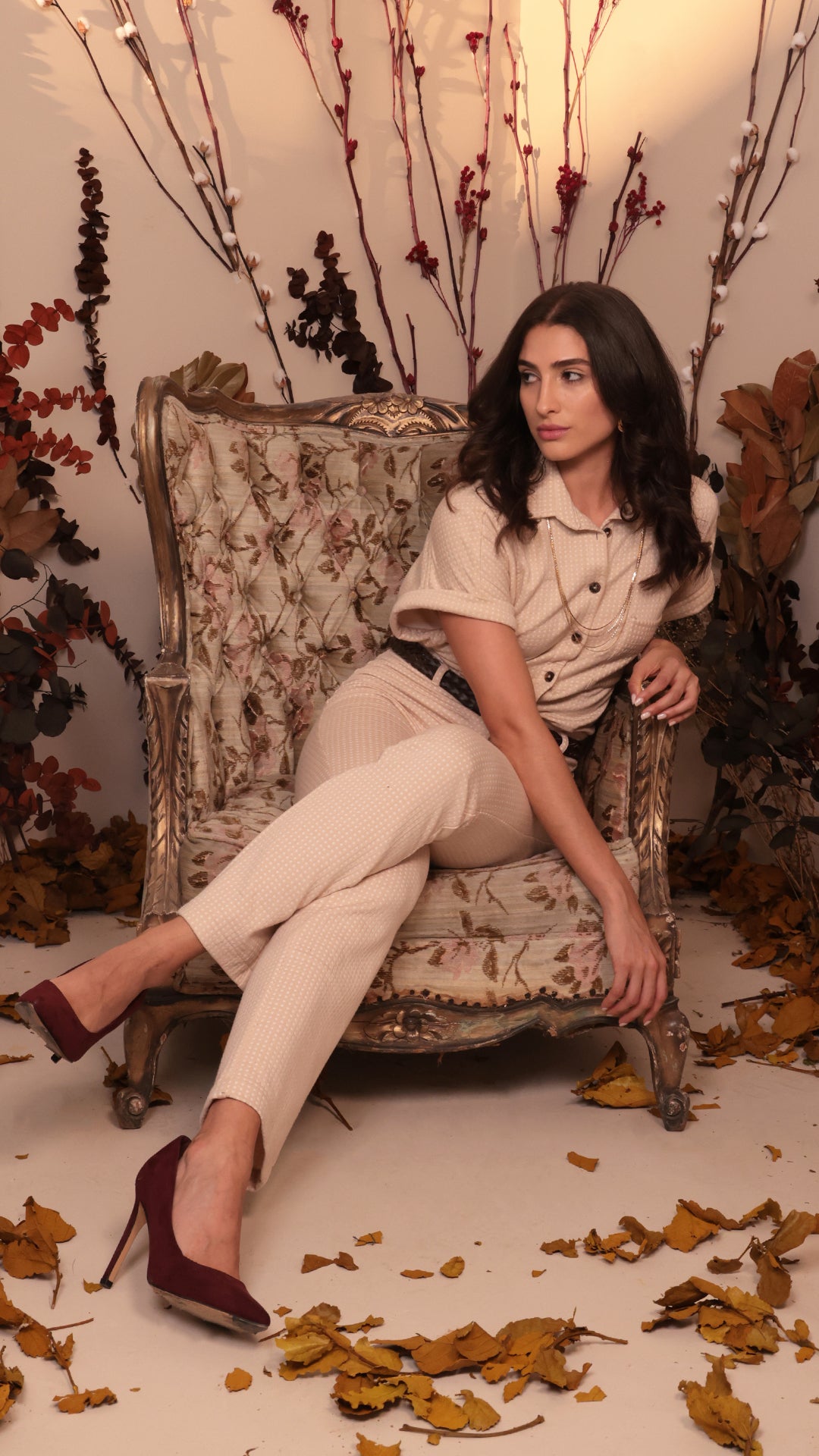 Pantalón de vestir con textura sutil. Corte recto y pretina con pasadores. Cierre frontal con botón y cremallera. Incluye cinturón trenzado en color marrón. Confeccionado en tela suave y ligeramente elástica.