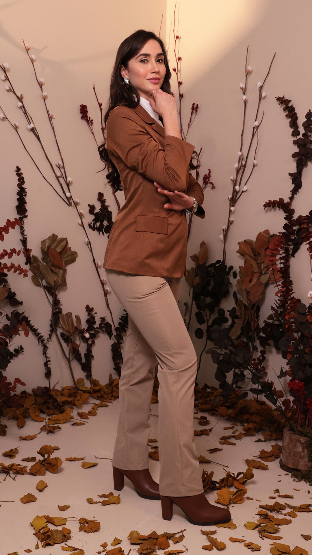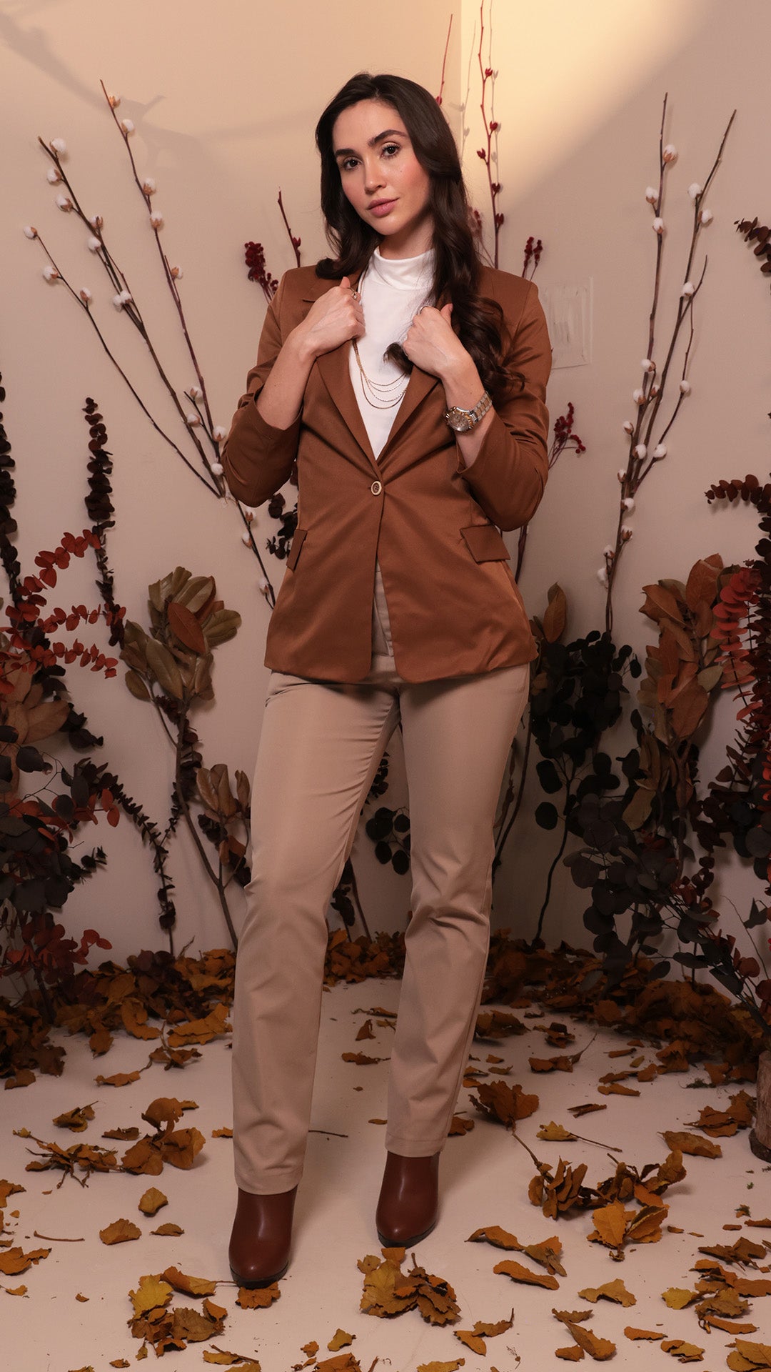 Saco de corte recto confeccionado en tela de acabado liso brillante con ligera estructura. Presenta solapa clásica y cierre frontal de un botón al tono.
