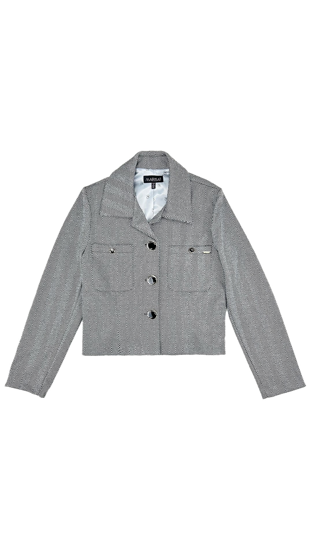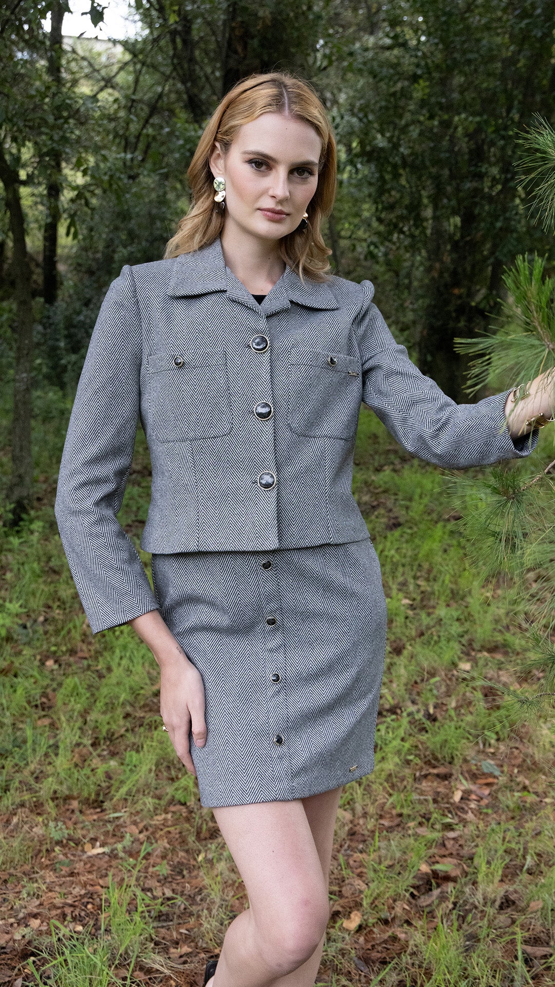 Saco corto de estilo clásico con solapa amplia y cierre de botones frontales. Confeccionado en tela de espiga en tonos negro y beige, incluye bolsillos decorativos al frente que aportan un toque elegante y estructurado.