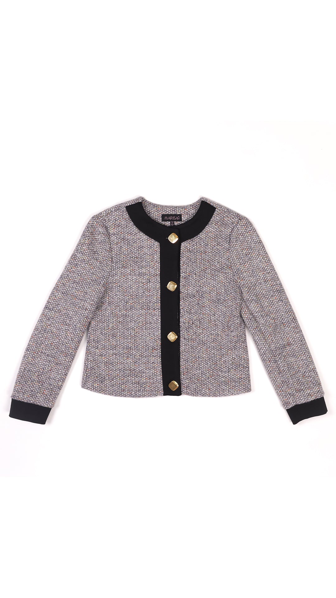 Saco de corte recto en tejido tipo tweed con textura estructurada. Escote redondo sin solapa y cierre frontal con botones metálicos dorados.