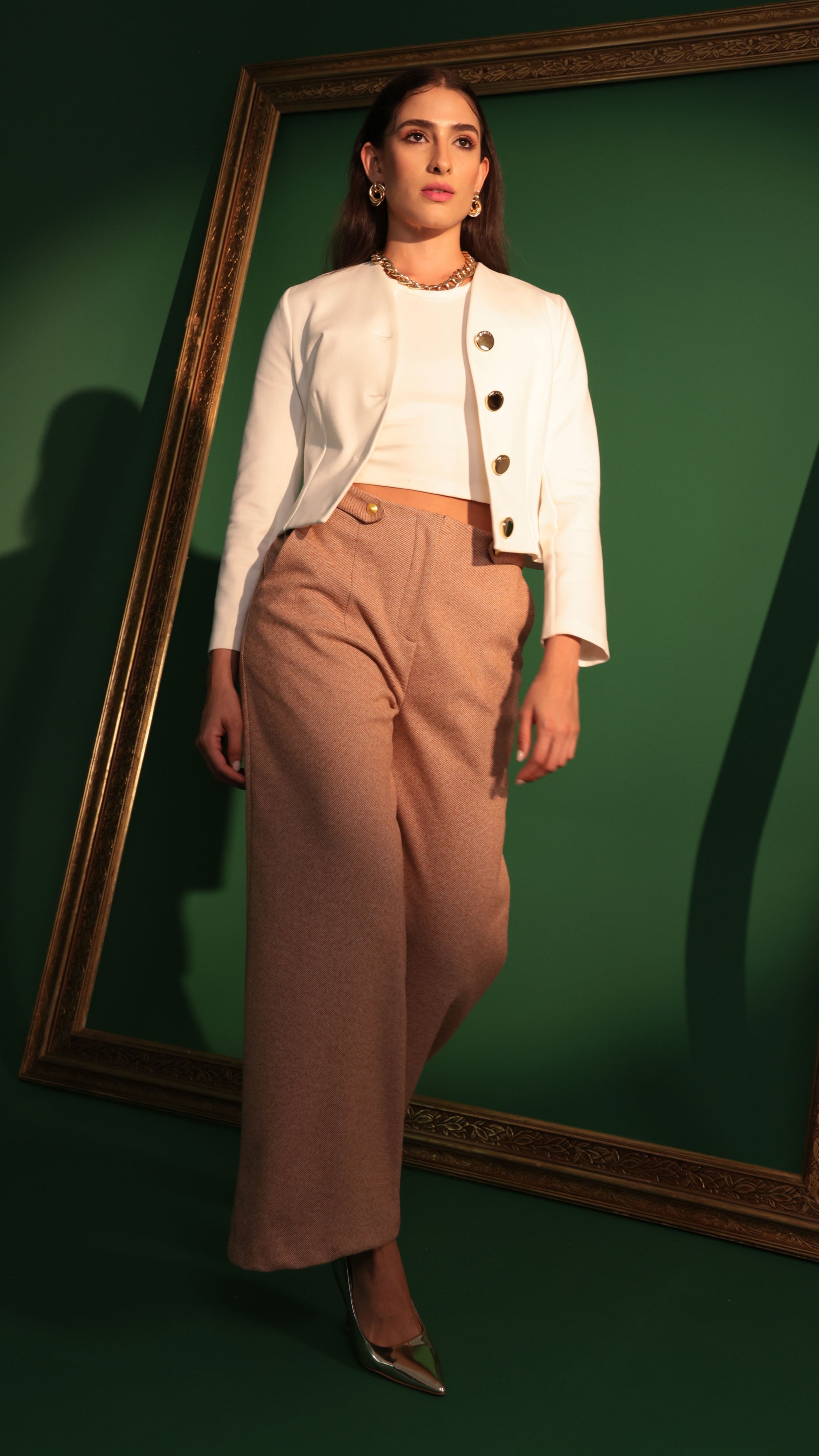 Saco confeccionado en tejido suave. Presenta corte entallado, escote en “V” y cierre frontal con botones metálicos decorativos. Cuenta con solapas finas y manga larga.