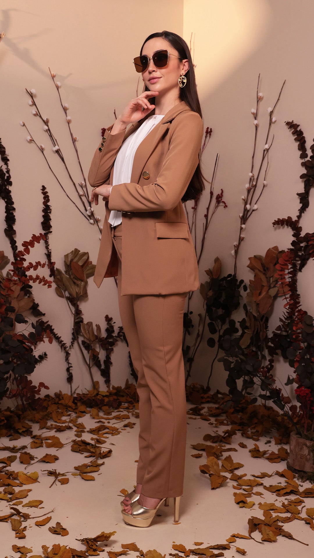 Cuenta con solapa clásica de muesca (notch lapel) y cuello estructurado. Mangas largas con corte recto. Presenta bolsillos laterales con tapa.