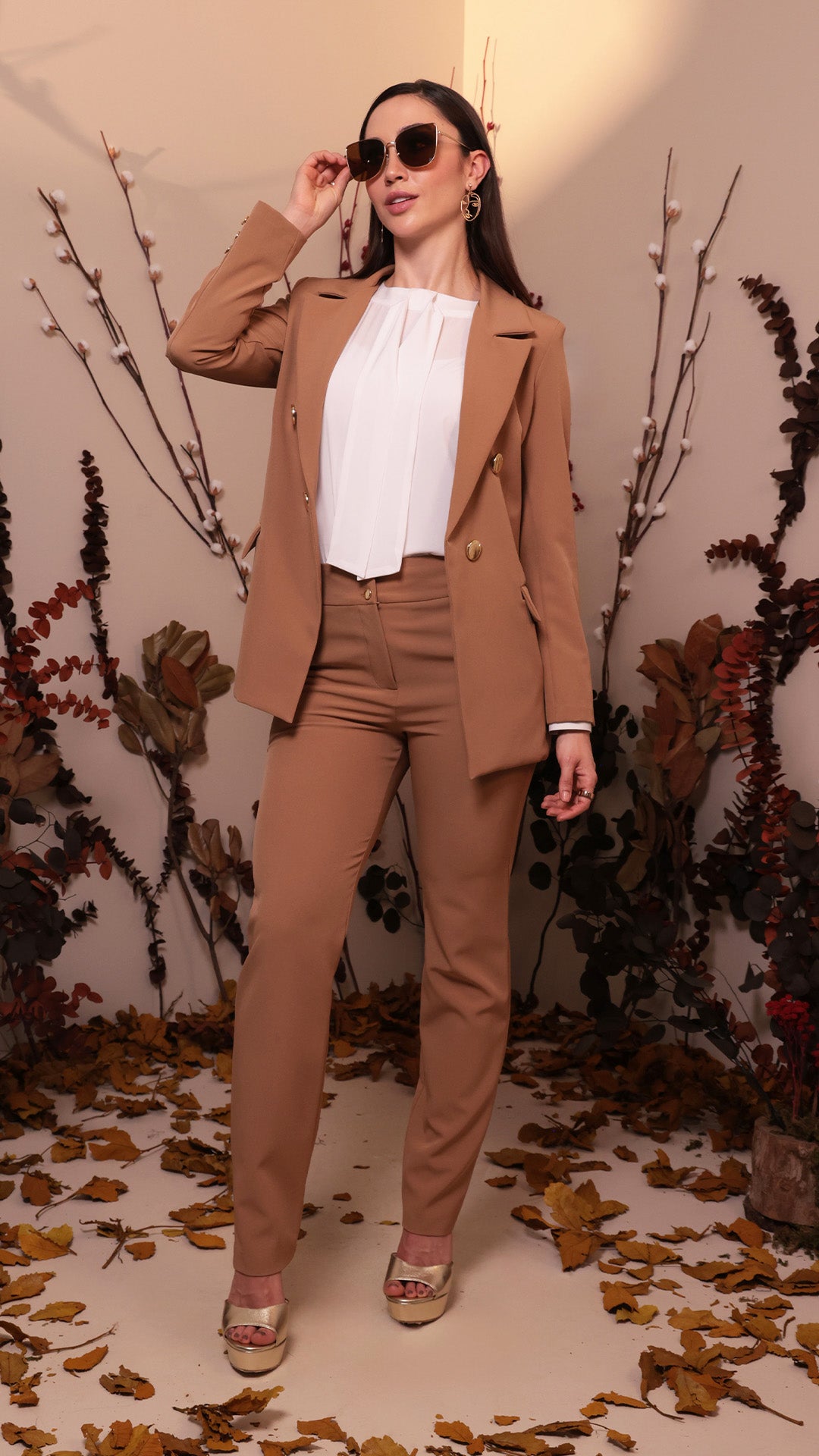 Saco tipo blazer con diseño cruzado (double breasted) con botones metálicos circulares en acabado dorado al frente.