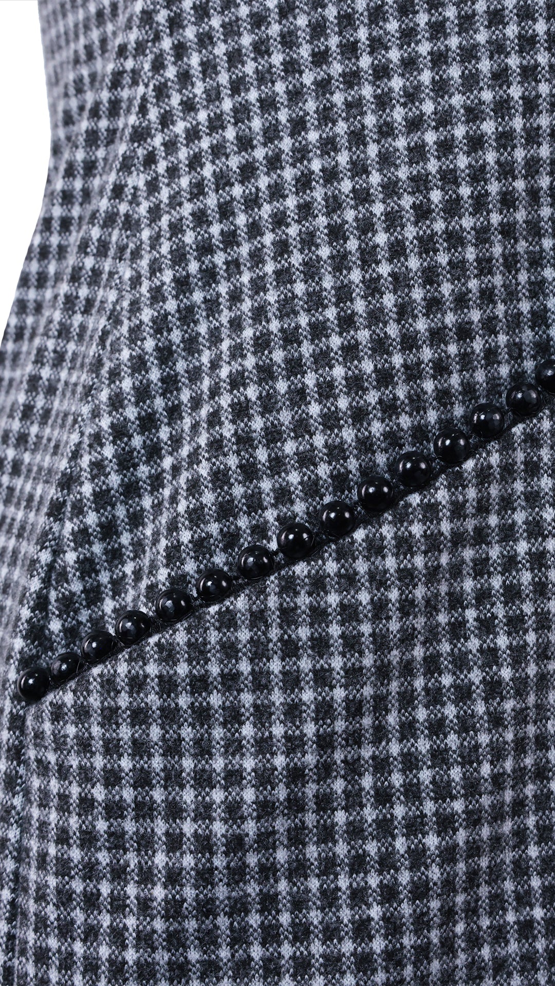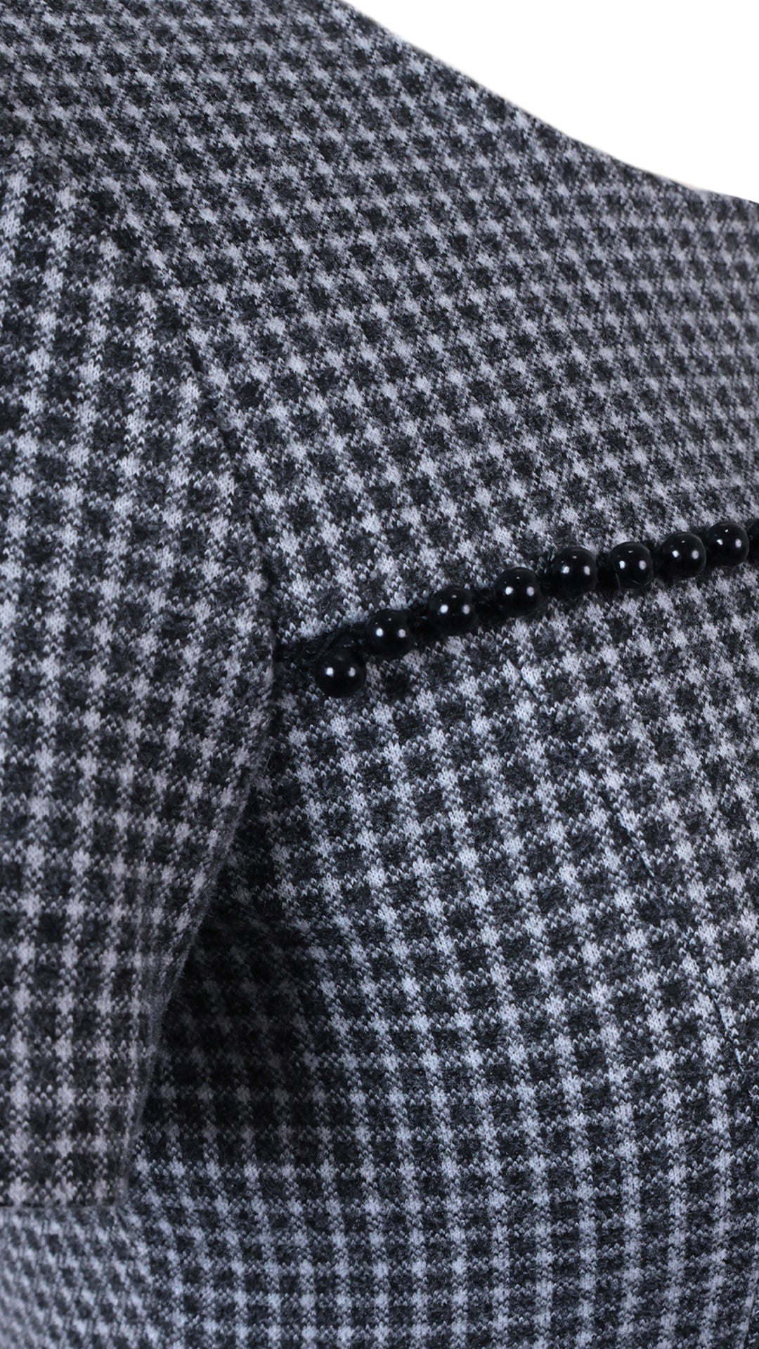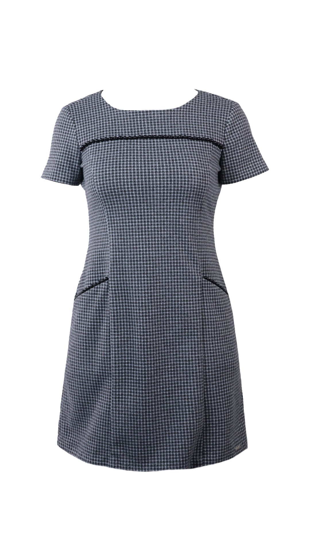 Vestido corto confeccionado en tela de patrón geométrico con cuerpo medio. Presenta escote redondeado y manga corta, con costuras de entalle que moldean la silueta de forma sutil. Incorpora bolsillos laterales funcionales con detalle decorativo y aplicación horizontal al frente.