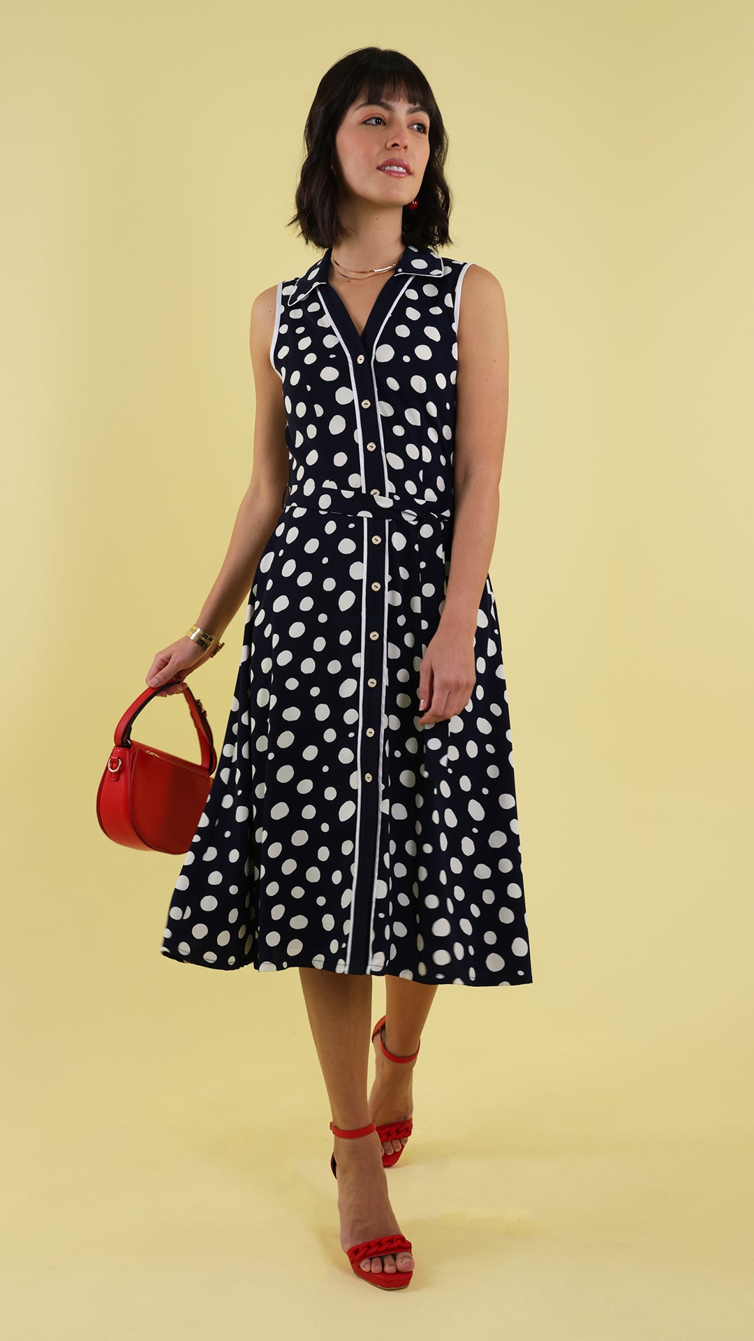 Presenta estampado de lunares, detalle de vivos en contraste al frente y en el cuello, y cinturón del mismo tejido para ajuste en la cintura. Falda con vuelo y largo debajo de la rodilla.